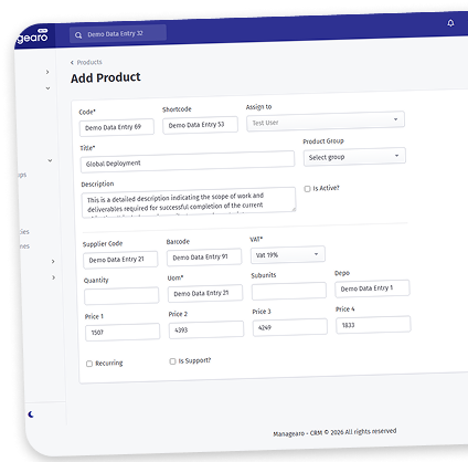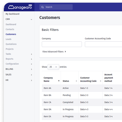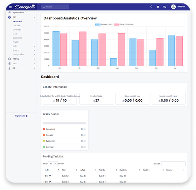 The CRM module is the foundation of Managearo. It brings customers, leads, quotations, projects, and communication into one workspace, so your team stays aligned and in control